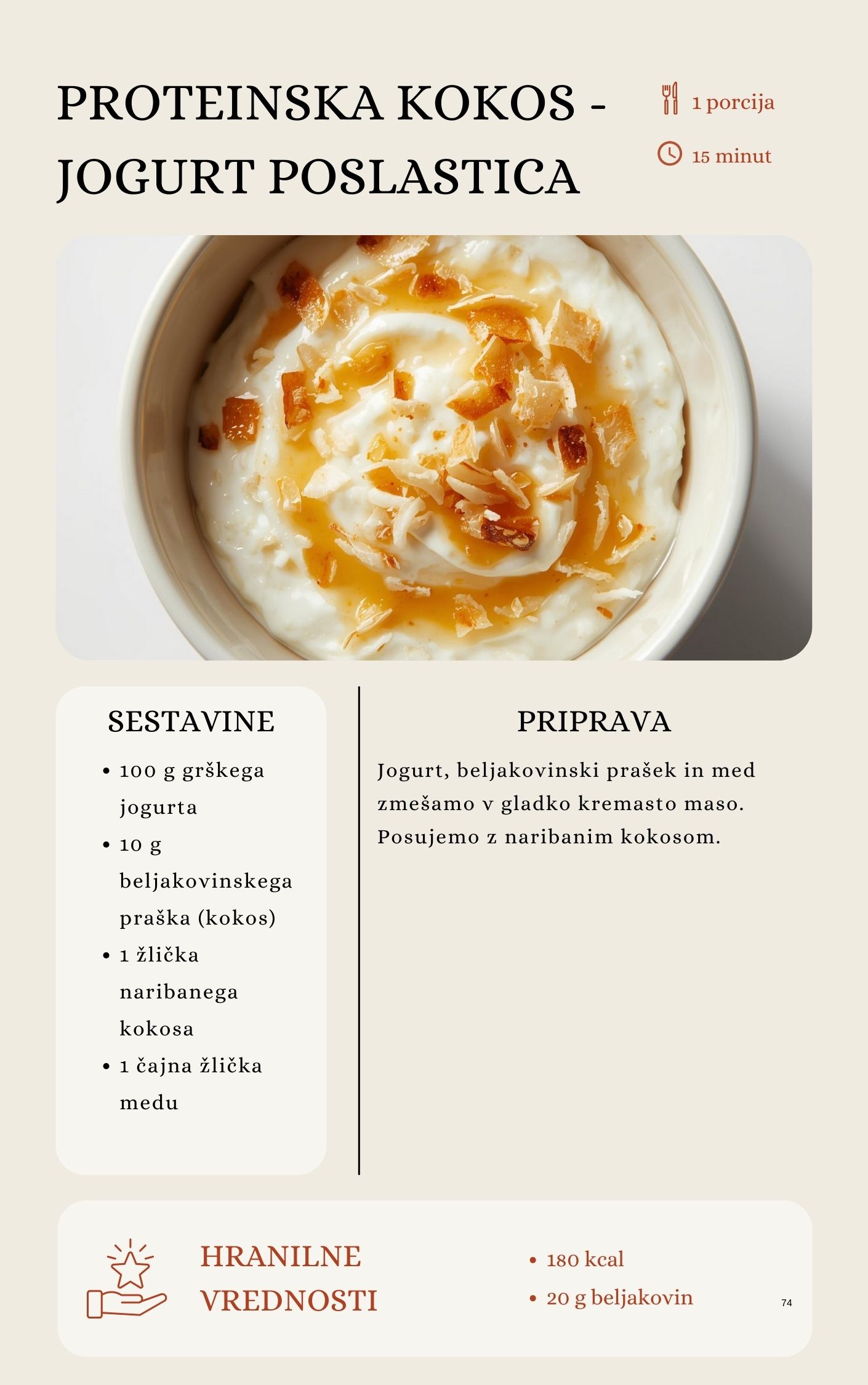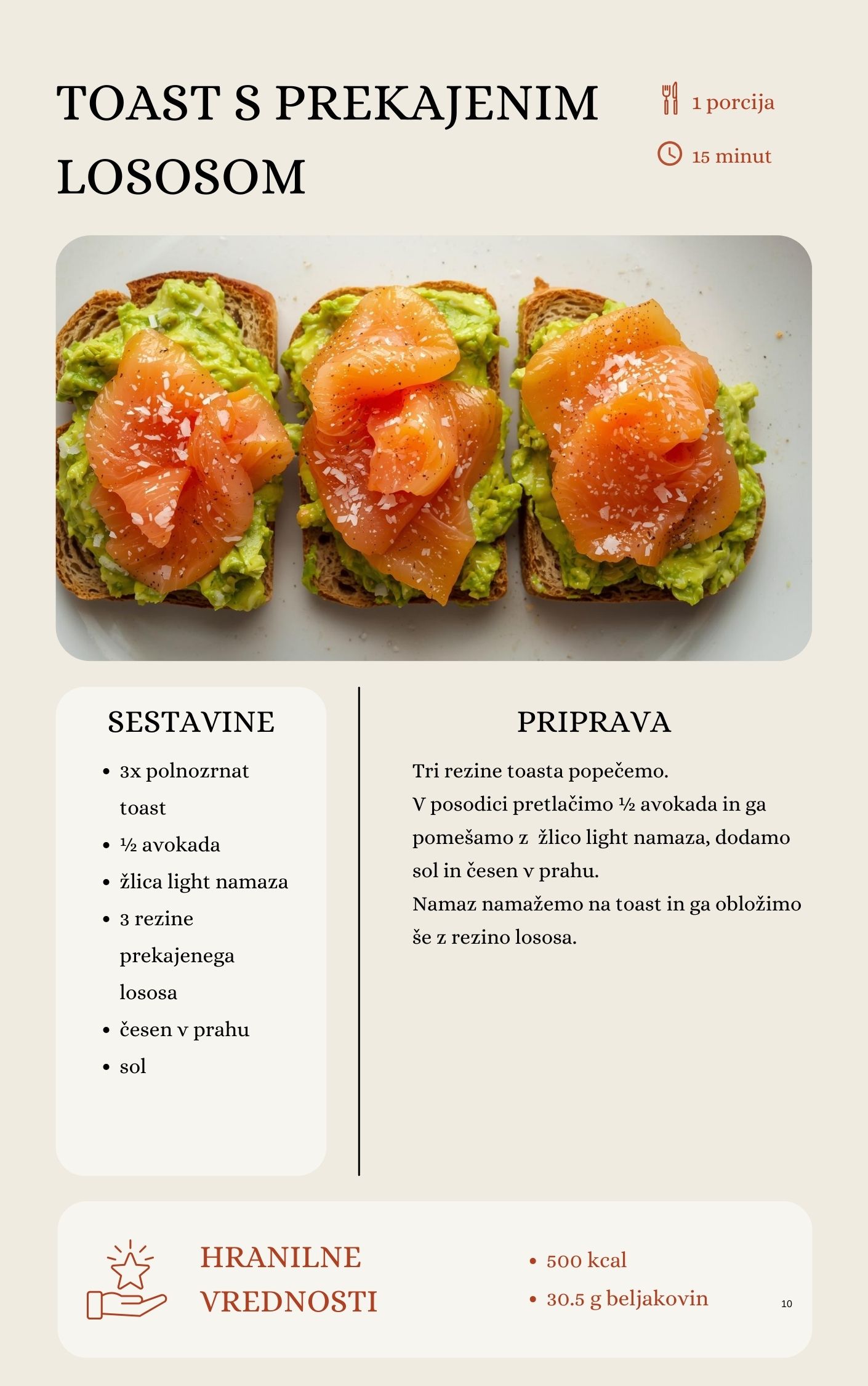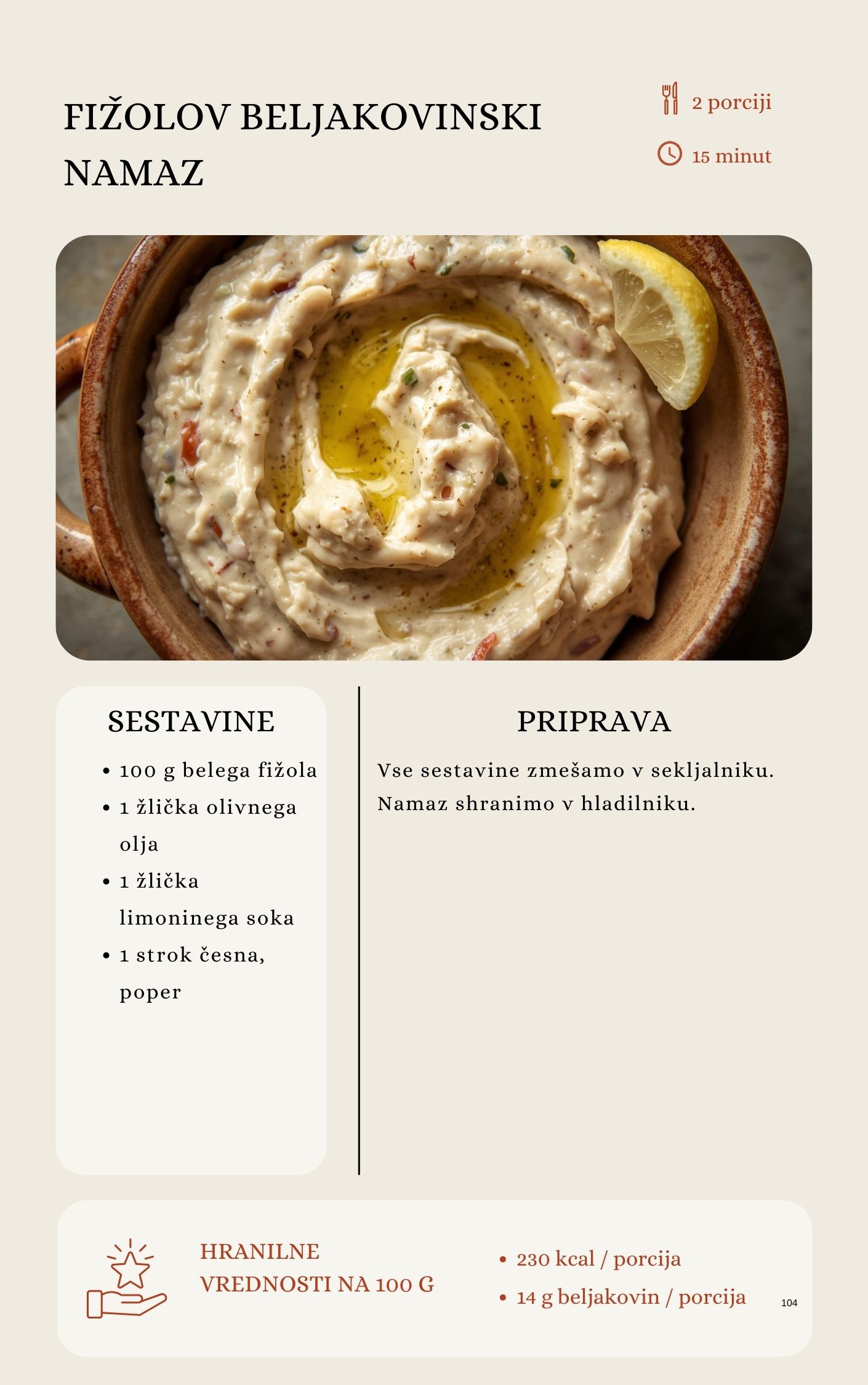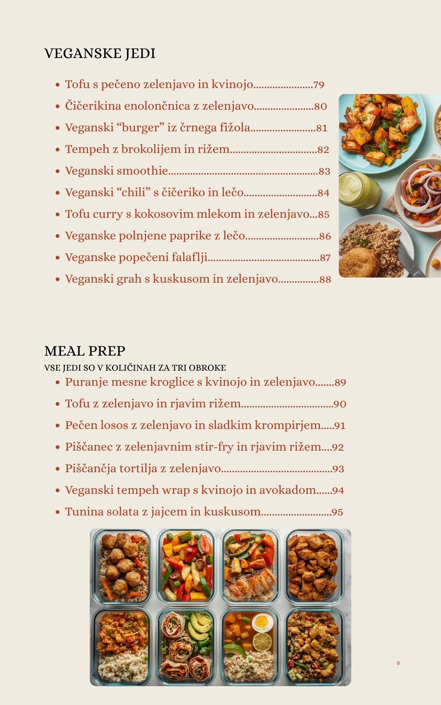 V knjigi je 100 receptov za zajtrke, kosila, večerje, prigrizke in celo zdrave sladice. Vsi so enostavni, z običajnimi sestavinami, poleg tega pa vključujejo iskalnik po makrih in ciljih zdravega življenjskega sloga.